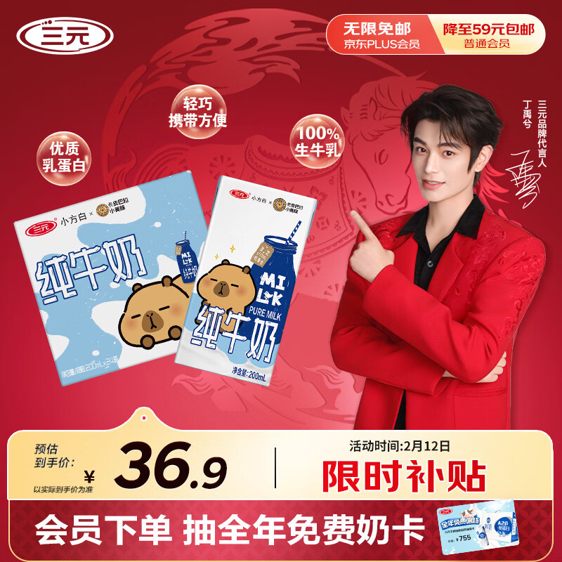 ,【自营】三亓 小方白牛奶24盒 任选3件100.7亓,新客减2亓 *