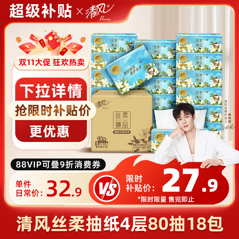 13.28亓清风花萃丝柔4层加厚80抽18包 桃金帀页面加购 用88-5